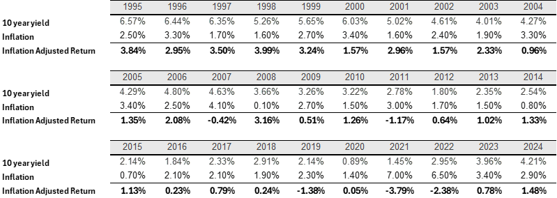 Here again are the 10-year rates along with inflation data from each year and the inflation adjusted return.